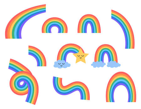 Colorful rainbow set. Vector collection of cute rainbows with 7 colors, clouds and star. Different shapes for kid design. flat illustration.