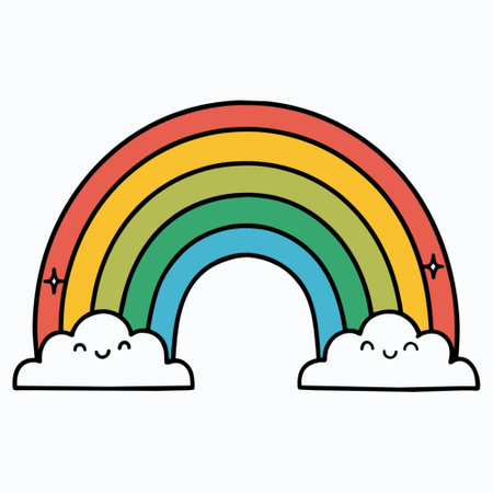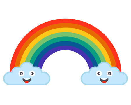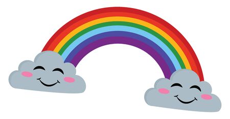 Rainbow emerging from two clouds with smiling faces, vector, color drawing or illustration.