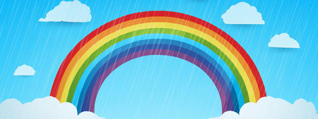 Rainbow and clouds on blue sky background. Illustration.