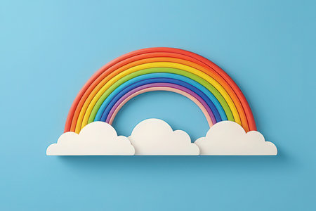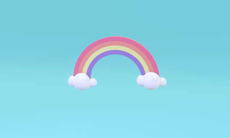 Rainbow and clouds on blue background. 3d render illustration.