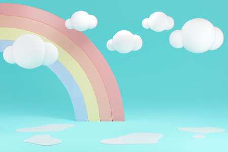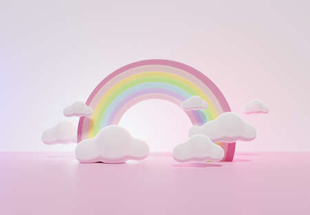 3D rendering of colorful pastel clouds and rainbow with empty space for kids or baby products.