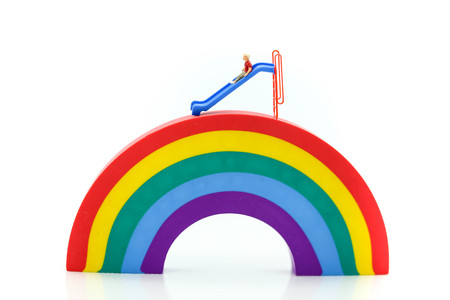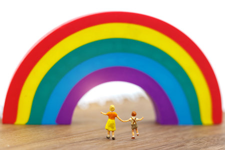 A LGBT relationship signified by two small yellow toy figures standing side by side, both beside a colourful rainbow.