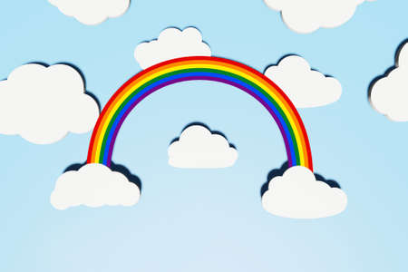 LGBT Pride concept. Abstract background with LGBT rainbow and different shape white flat clouds with shadows over blue sky. Creative layout. Copy space, 3d render