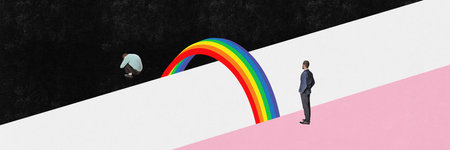 Contemporary art collage. Man in suit stands on pink edge and looks at another seating man across rainbow bridge on black side. LGBTQ support. Concept of love, relationship, equality. Banner for ad
