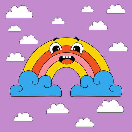 Funny cartoon character. Groovy element funky rainbow on an acid background with clouds. Vector illustration trendy retro cartoon style. Comic element for sticker, square poster, graphic tee print, card
