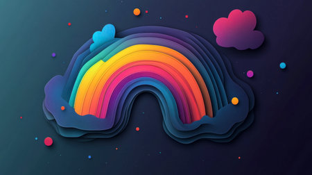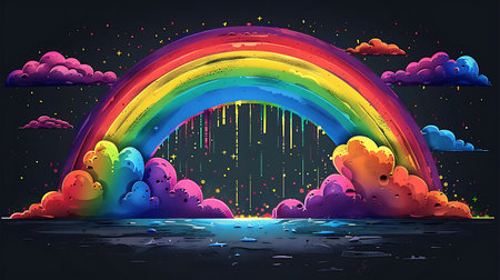 Displaying four-band rainbow and smiling clouds on dark canvas backdrop, with pale mint light beam. Whimsical, vibrant, illustrative, playful, fantasy, joyful, colorful