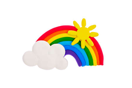 plasticine rainbow, cloud, sun, rays on white background, isolate, plasticine creativity, children's hobbies, natural phenomenon, top view, concept