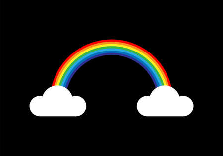 A vibrant, multi-colored rainbow arches across a black background. The rainbow consists of seven distinct colored bands: red, orange, yellow, green, light blue, dark blue, and purple. Two fluffy white clouds are positioned at the base of the rainbow, one on each side.