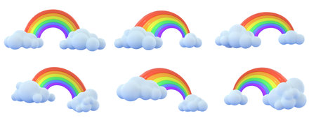 Cartoon 3D rainbows. Colorful rainbow with fluffy clouds, dreamy weather arch icons and fantasy sky elements. Colorful sky after rain, light spectrum gradients and weather forecast vector set