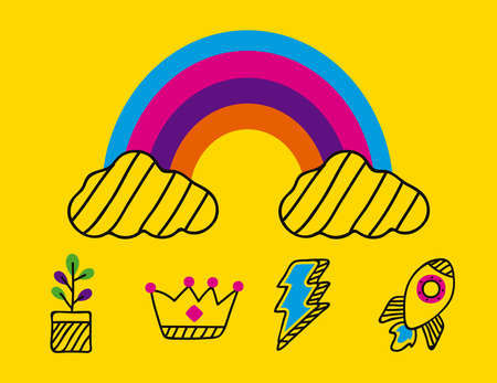 Set of cute clouds with rainbow and rainbows in different colors illustration