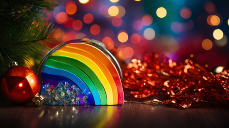 A vibrant rainbow crafted from soft materials features glowing lights and fluffy clouds, creating a warm atmosphere.
