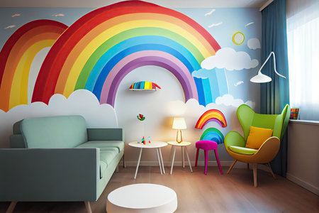 a rainbow-themed room, with fun wall murals and colorful furniture., created with generative ai