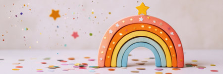Colorful wooden rainbow toy sits on a neutral surface, surrounded by stars and confetti, creating a joyful atmosphere for imaginative play and decoration