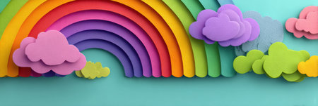 A bright rainbow crafted from felt materials displays various colors alongside soft, pastel-colored clouds set against a calming teal backdrop