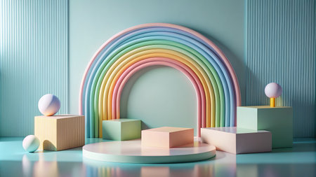 A colorful rainbow arch beautifully complements a circular stage in a vibrant studio setting, perfect for creative presentations or playful decorations.