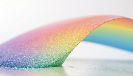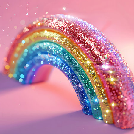 A close-up shot of a glittering rainbow, capturing its vibrant hues and sparkling texture against a soft pink backdrop.