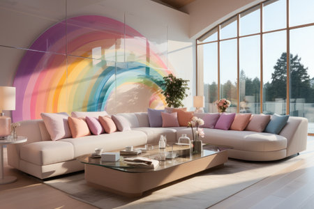 A spacious living room features a sofa, coffee table, and artwork. A rainbow of light is projected onto the wall and furniture, enhancing the interior. The composition benefits from natural lighting and suggests comfort. Suitable for illustrating home decor, interior design, and lifestyle themes for a variety of projects.