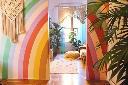 Bright and colorful interior featuring a rainbow wall design, cozy elements, and lush plants. A welcoming atmosphere ideal for home inspiration.
