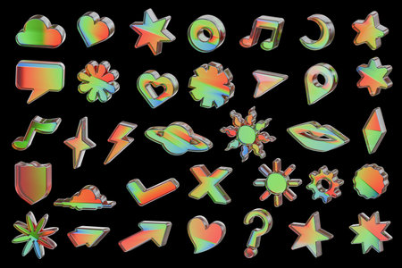 Y2k vibrant gradient shapes and symbols with rainbow colors - hearts and stars, hexagons and musical notes. Retro neon cyber aesthetic geometric elements for nostalgic digital art or trendy designs.