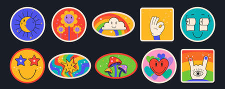 Cool Hand Drawn Retro Stickers Vector Design. Set Of Y2k Patches Pop Art Style. Smile Emoticon Funny Badges.