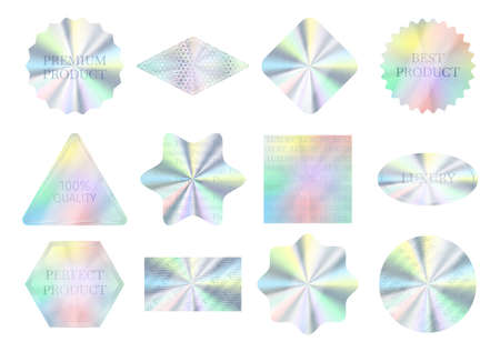 Holographic stickers. Hologram labels of different shapes. Sticker shapes for design mockups. Holographic textured stickers for preview tags, labels. Vector illustration