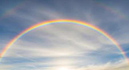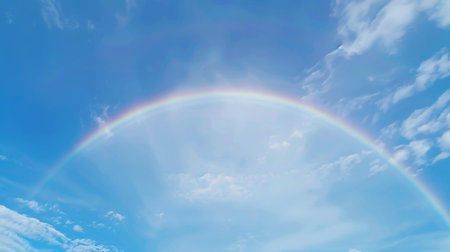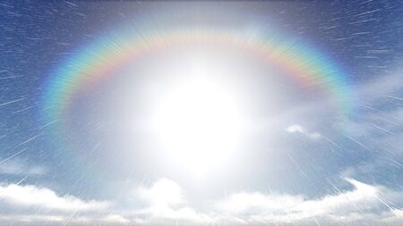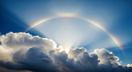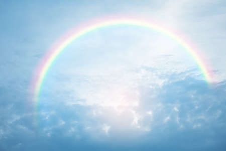 Rainbow in the blue sky with clouds and sun rays, background