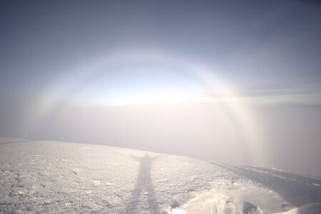 rare natural phenomenon in the mountains and at sea is the white rainbow. It looks like a solar halo, but not around the sun, but in the opposite direction. Accompanied by the Broken Ghost