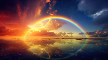 A stunning view of a sunrise over a calm ocean, featuring majestic clouds and a vivid rainbow around the sun, creating a serene and picturesque atmosphere.