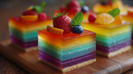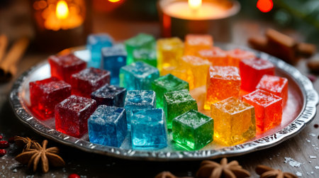 Colorful gelatin cubes pyramid arrangement sugary dessert sweet treat pastel background clean studio.