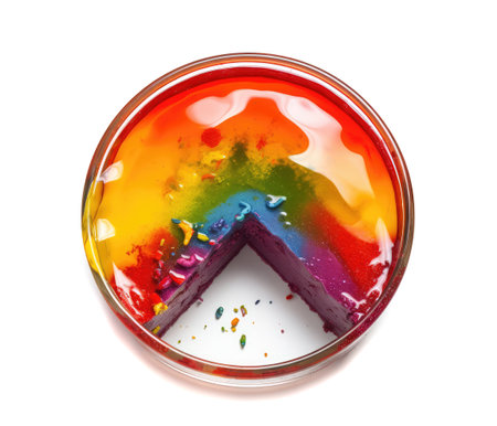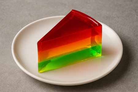 Colorful jelly cake slice on a white plate captured in simple composition. concept of vibrant dessert, minimalist art, creative culinary presentation.