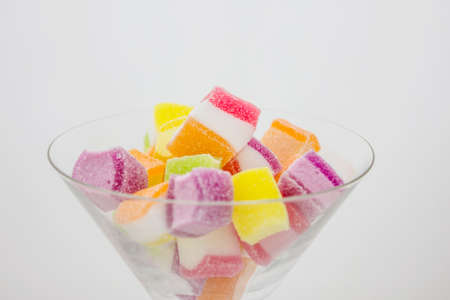 Macro photo food dessert jelly sweets. Texture background fruit jelly sweets candies. Image of fruit marmalade candy .Multicolored marmalade is located on a white background, horizontal photo