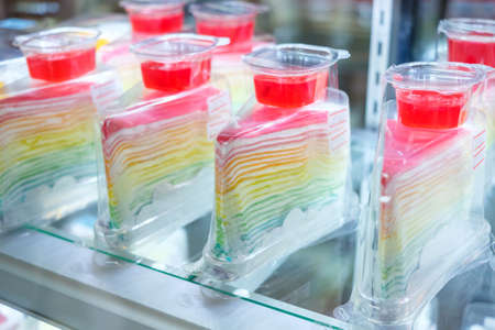 Rainbow crape cakes with strawberry jam in the regrigerator in the coffee shop