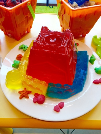 Colorful jellies in plastic bowls arranged in a pile and photographed from above (Selective Focus, Focus on the rim of the left red jelly)