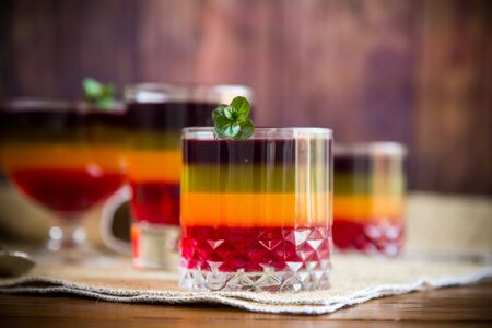 Three glasses of colorful striped jelly on a natural background. Rainbow jelly for kids party. Close up.