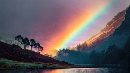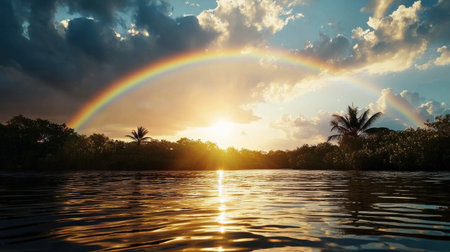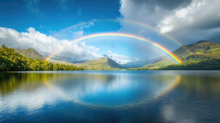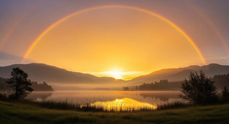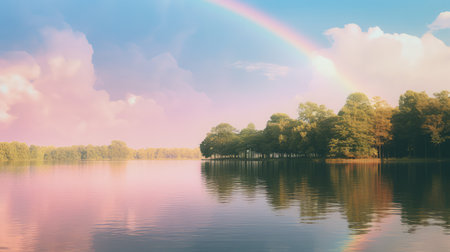 A stunning view of a calm lake at sunrise enhanced by a vibrant rainbow arch. The surrounding lush trees reflect the colorful scene, creating a serene atmosphere.