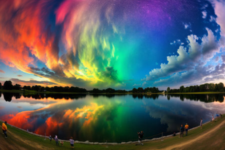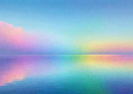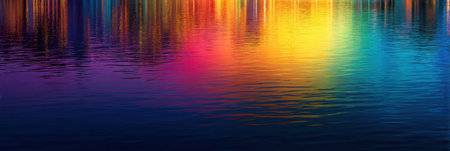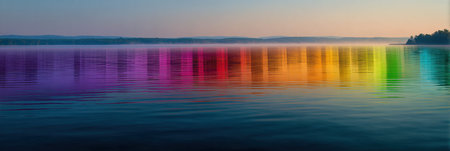 Rainbow colors are reflecting on a tranquil lake water surface, creating a vibrant and colorful abstract image