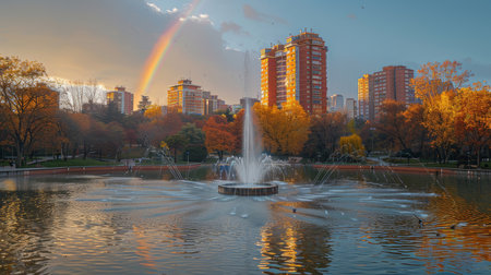 A serene view of Sazova Park in Eskisehir, Turkey. The frame captures a stunning fountain and a vibrant rainbow set against tall buildings and autumn foliage.