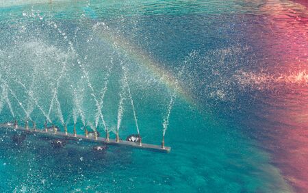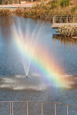 Fountain with rainbow in the artificial pond.