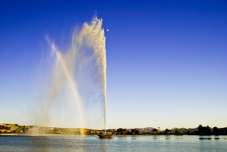 View of the highest Fountain in the world, Fountain Hills Arizona USA, with large spray and Rainbow with half Moon in the background