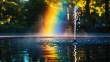 A rainbow appearing through the mist of a fountain in a city park, with colorful light reflecting off the water droplets.