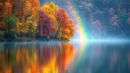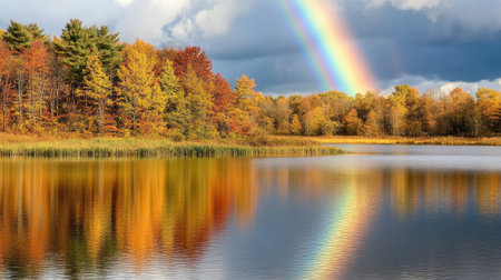 A rainbow reflecting off a calm, glassy lake with surrounding autumn foliage, creating a serene and picturesque scene.