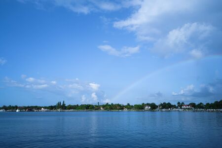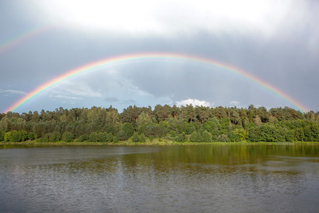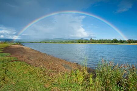 Beautiful rainbow over the river in summer day.