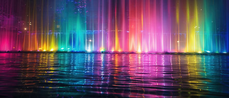 A stunning display of colorful light beams reflects off a wet surface, creating a captivating and abstract light show.