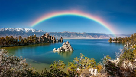 scenic view of rainbow over paoha island at mono lake