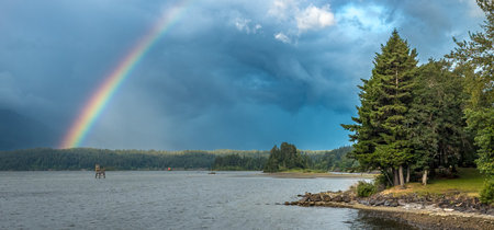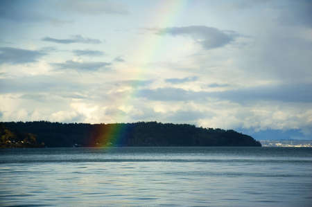 A brilliant rainbow over Puget Sound near Tacoma, Washington.