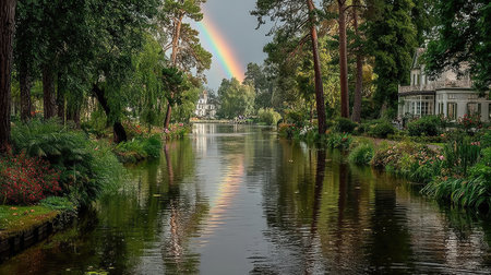 Rainbow over the river in the park of Bruges, Belgium