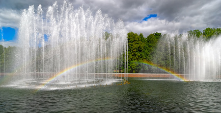 Rainbow in the park fountain in a sunny summer day. A riot of colors. Travel photos. Beautiful places for walking