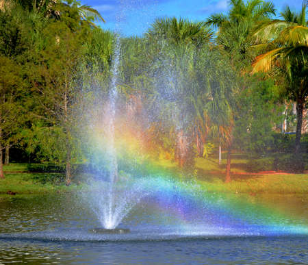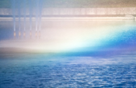 closeup fountain in lake with rainbow