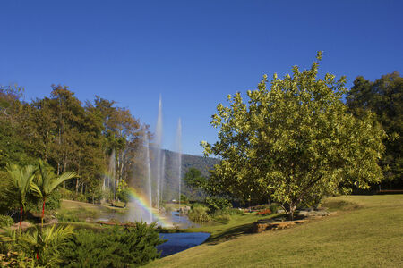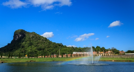 Rainbow in water fountain and Green Mountain