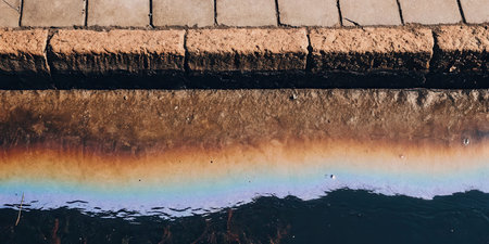 Gas leak incident fuel spreading from leaking tank on asphalt creating rainbow sheen effect